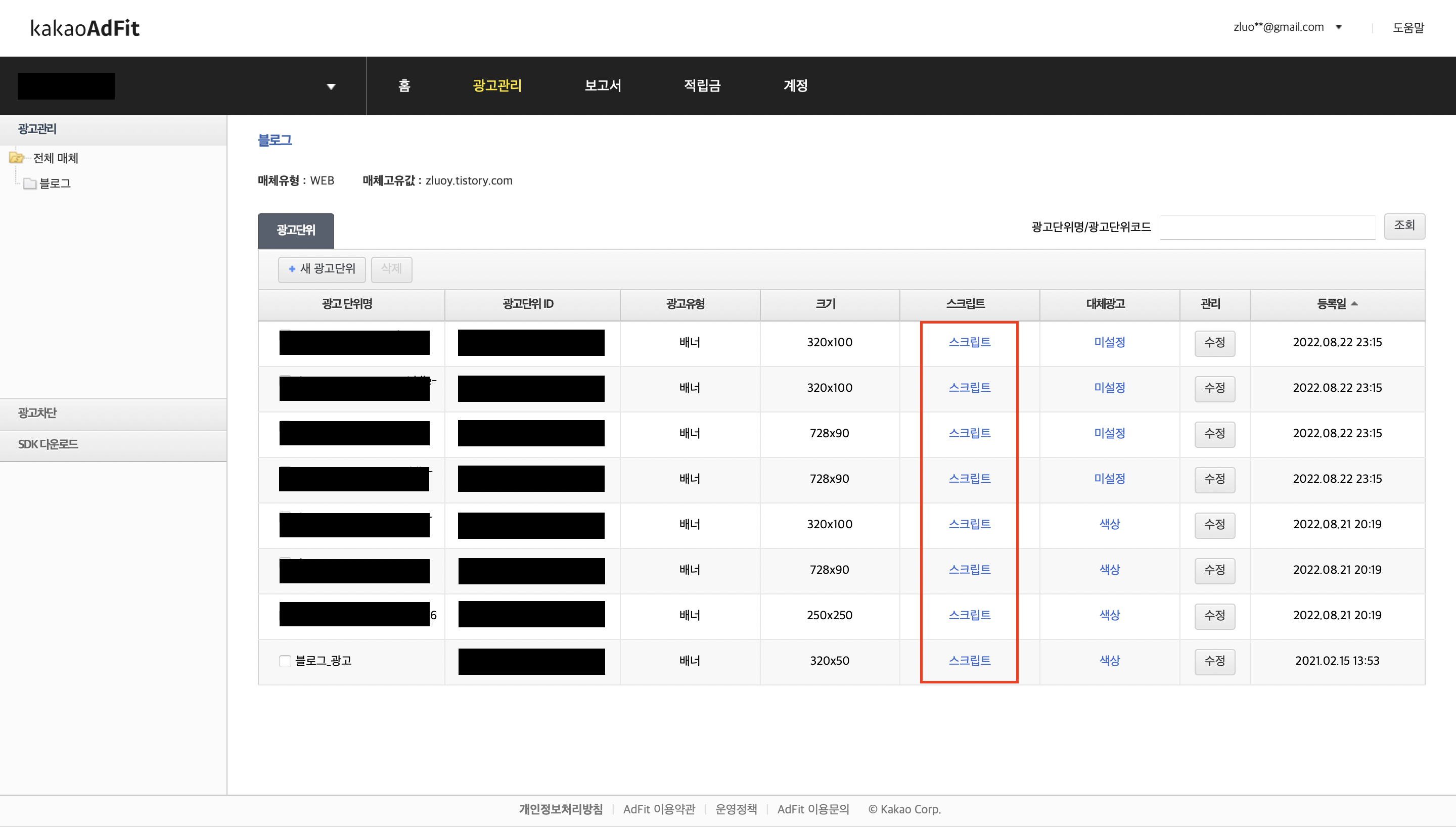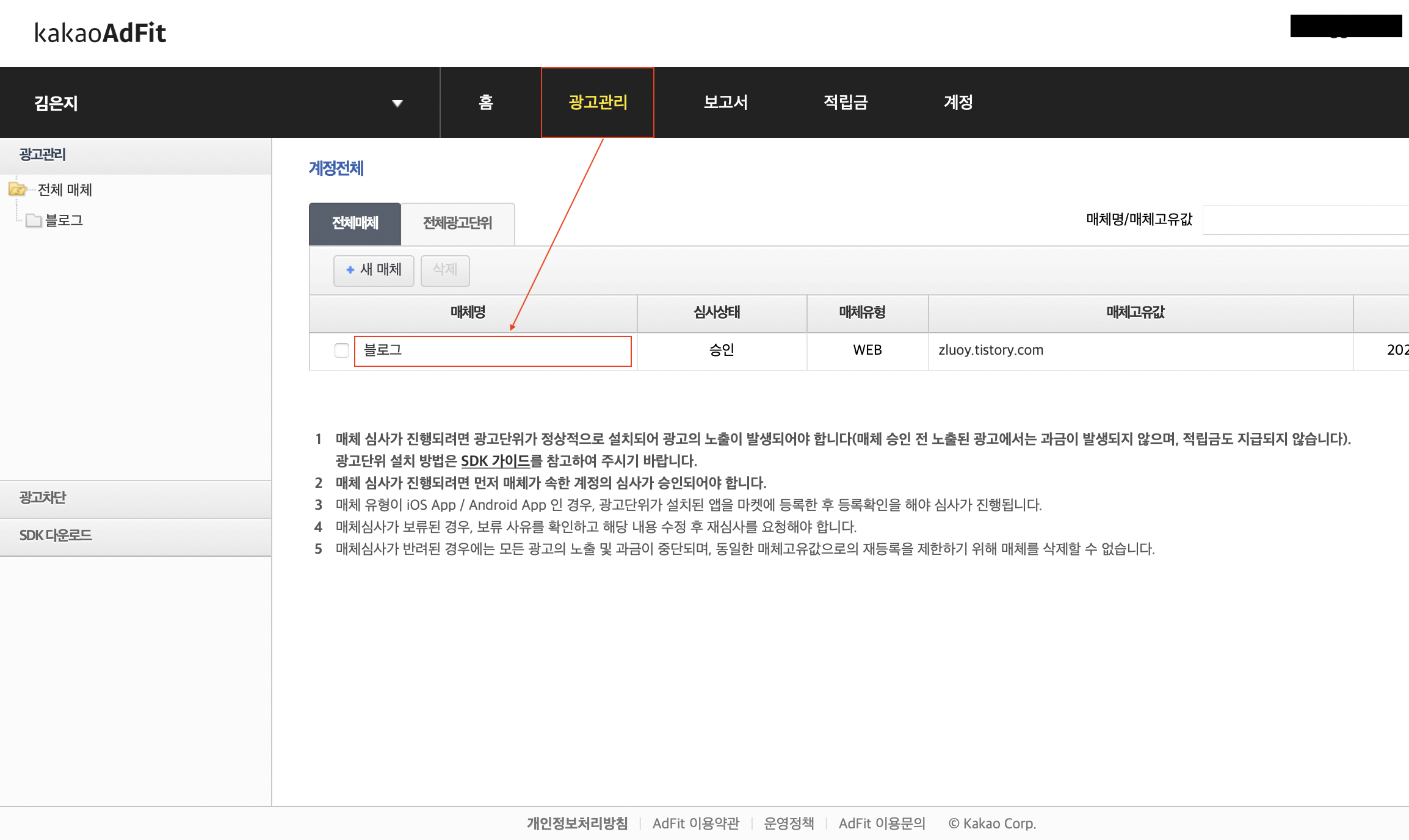 1. 카카오 애드핏 접속 > 광고관리 > 블로그 클릭