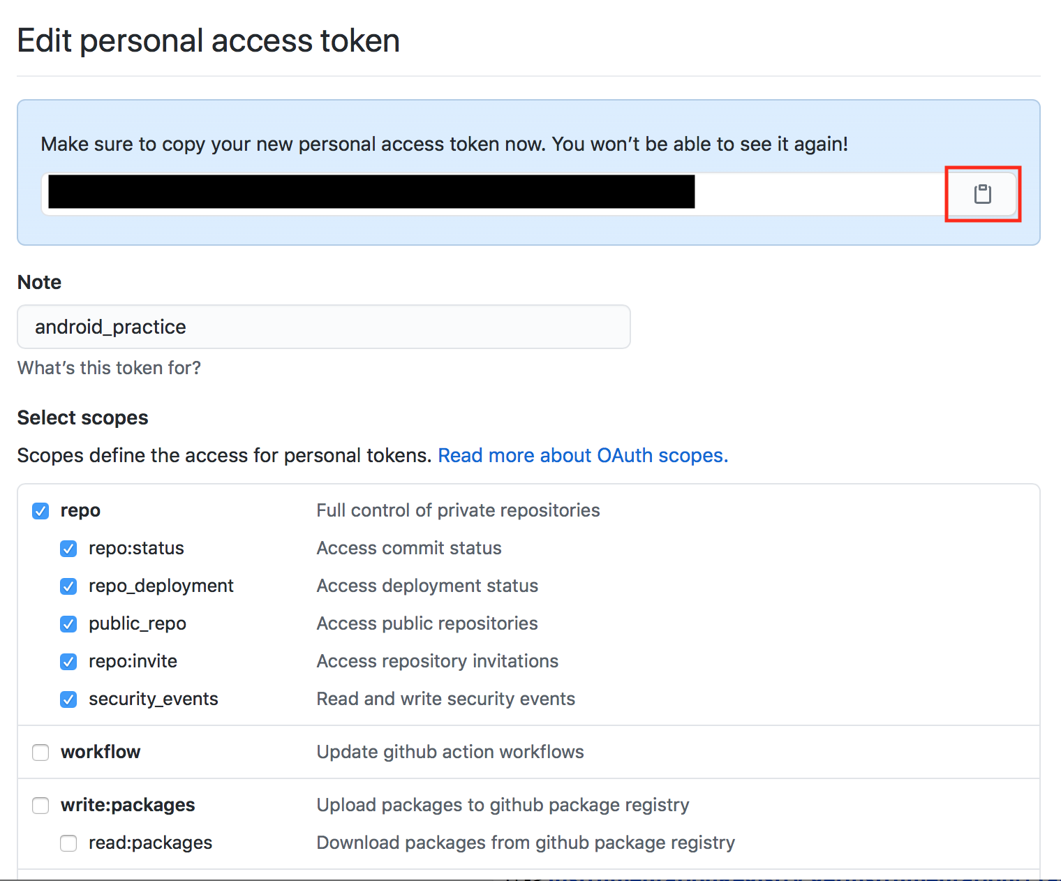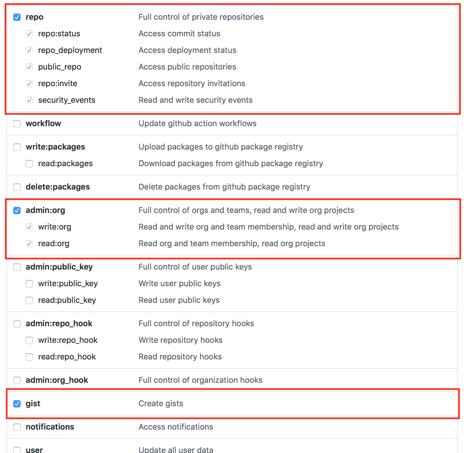 5. 화면 중앙에 repo, admin:org, gist check - Generate Token